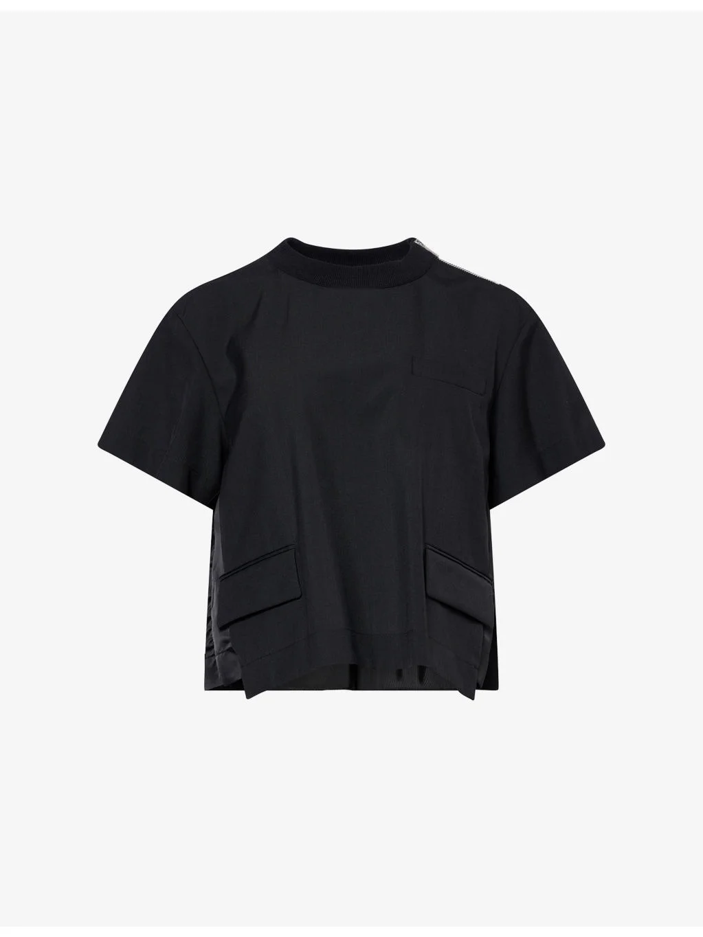 PRODUCT DETAILS - Sacai woven top - 70% polyester, 30% wool; contrast 100% nylon - Zip fastening at shoulder - Relaxed fit, cropped, round-neck, short sleeves, welt pocket and two flap pockets at front, contrast texture and pleat at back - Dry clean - True to size - Model is 5ft 10in/1.78m and wears a size small - Lightweight, slight stretch Ref: R04568030