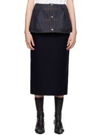 Non-stretch denim and wool melton midi skirt. · Paneled construction · Mini skirt-style overlay at waistband · Pleats at waistband · Button closure · Welt pockets · Zip closure at back waistband · Adjustable button tabs at back · Central vent at hem · Partial satin lining · Logo-engraved silver-tone hardware · Contrast stitching in tan Supplier color: Indigo Body: 100% cotton. Body 2: 100% wool. Lining: 100% cupro. Made in Japan 242445F092027