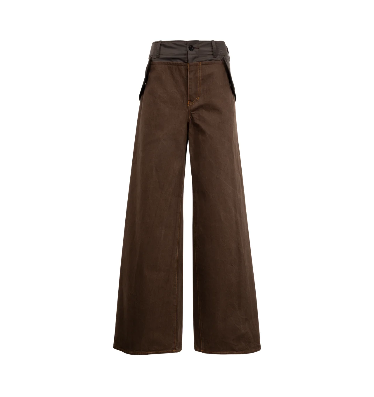 SACAI Denim Pants featuring wide-leg, cotton denim design and a spliced nylon double-waistband, belt loops, side slit pockets with flap, 2 back welt pockets, adjustable waist and zip fly. 100% cotton. 100% nylon. Made in Japan. DESIGNER STYLE ID: 25-07965 COLOR: 601 BROWN