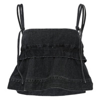 600078384BLK001 / 26-08412/00/001 - Adjustable tie shoulder straps - Strapless bandeau silhouette - Raw-edge construction details - Tiered ruffle panels - Premium denim fabrication - Fitted bodice with structured support The sacai Denim Pullover delivers avant-garde streetwear with architectural construction and feminine silhouette. Crafted from premium black denim with raw-edge detailing and adjustable tie straps for customizable styling. The strapless design and layered construction showcase sacai's signature deconstructed aesthetic.