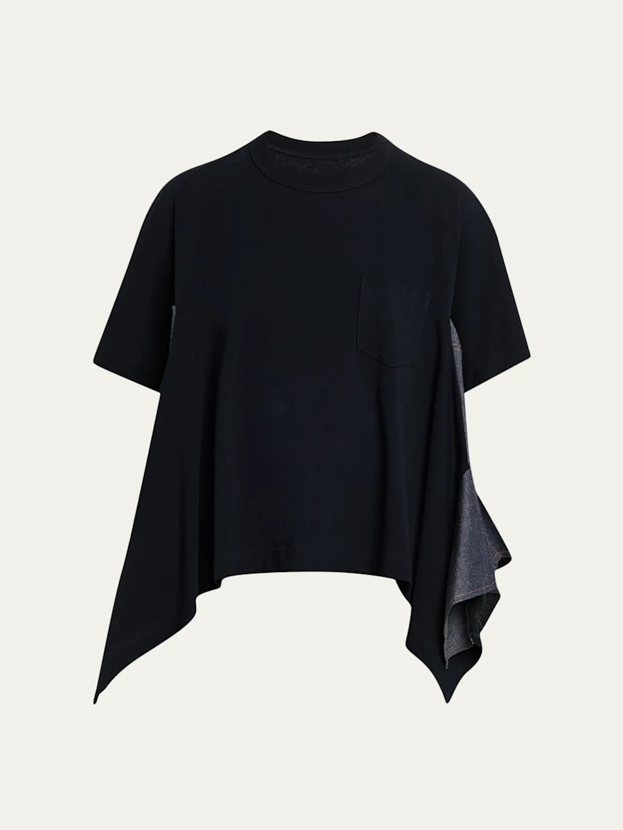 Crafted from cotton jersey, this Tshirt from SACAI features mediumwashed denim side panels and a handkerchief hem Crew neckline Short sleeves Chest patch pocket Boxy fit Hip length Handkerchief hem Pullover style Cotton Dry clean Made in Japan SIZE amp; FITModel measurements: 5'10" tall Model is wearing a US size 4/Small