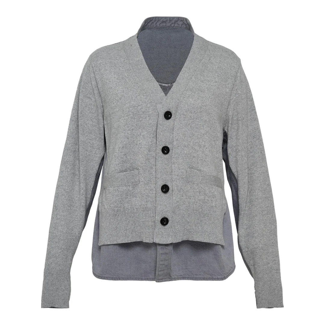 600069855GRY004 / SCW-285/00/301 - V-neck knit cardigan construction - Integrated denim shirt collar and hem - Four-button front closure - Contrast material layering - Ribbed knit cuffs and waistband - Relaxed fit silhouette The sacai Denim x Knit Cardigan delivers innovative hybrid construction with signature layered design philosophy. Crafted from premium knit wool with integrated denim shirt elements, featuring contrast textures and materials throughout. The deconstructed silhouette and sacai's signature material mixing create a distinctive piece that bridges casual and refined aesthetics.