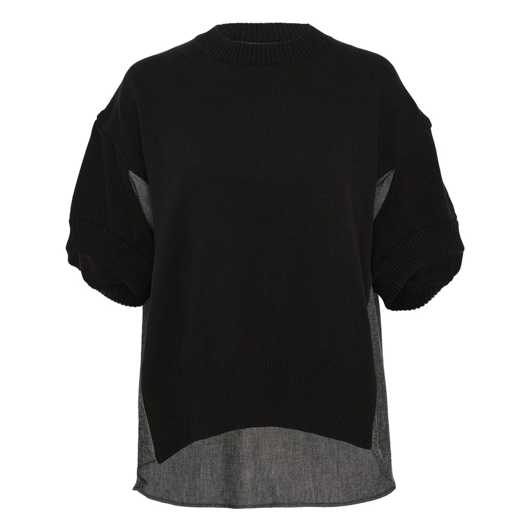600078423BLK001 / 26-08320/00/001 - Black knit body with gray denim contrast panels - Crew neckline with ribbed collar - Three-quarter sleeves with gathered ribbed cuffs - Asymmetrical hem with denim back panel - Relaxed oversized fit - Mixed fabric construction sacai Denim x Knit Pullover delivers innovative hybrid design with the brand's signature fabric mixing technique. Crafted from premium black knit construction with contrasting gray denim paneling at the back hem, featuring relaxed fit and ribbed detailing. The deconstructed silhouette showcases sacai's architectural approach to contemporary luxury streetwear.
