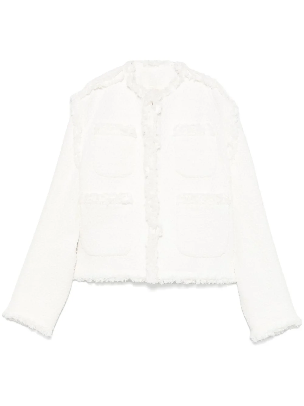 distressed-denim jacket Highlights - White - Front hook and eye fastening - Four front patch pockets - Waist tabs - Fringe detailing Imported Composition Lining: Cupro 100% Outer: Cotton 100% SIZE & FIT Model measurements Height 5 ft 11 in(1.8 m) Bust/Chest 33.07 in(84 cm) Hips 37.4 in(95 cm) Waist 25.19 in(64 cm) FittingInformation Designed to be unstructured, offering a loose fit throughout The adjustable tabs allow for fitted preferences Made from a midweight non-stretch fabric Washing instructions Dry Clean Only