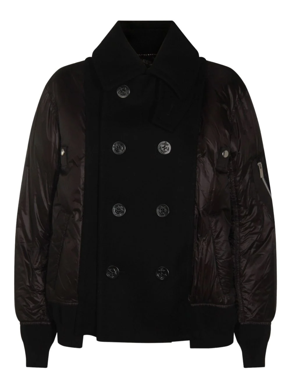 double-breasted puffer jacket Highlights - Black - Wool panel - Quilted design - Double-breasted - Button fastening - Side pockets Imported Composition Lining: Nylon 100%, Goose Down 90%, Goose Feather 10% Outer: Polyester 100%, Wool 100% Washing instructions Read Manufacturer Guidelines