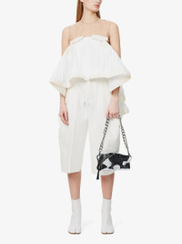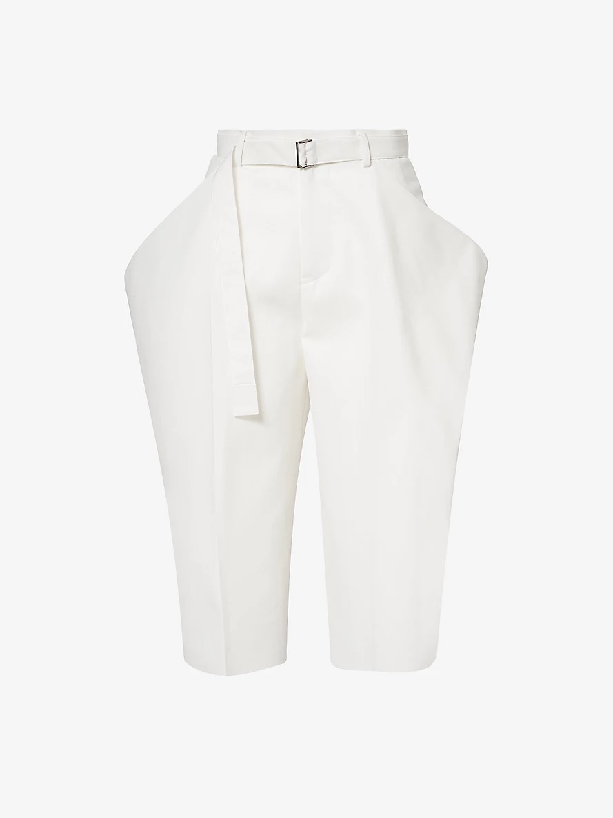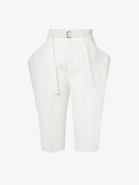 PRODUCT DETAILS - Sacai woven trousers - 70% polyester, 30% wool; lining 100% cupro - Button, hook-and-eye and zip-fly fastening - Regular fit, high rise, cropped wide leg, structured waistband with belt loops, exaggerated slip pockets at front, pockets at back, pressed centre creases, lined - Dry clean - Made in Japan - True to size - Size small: rise 12.5in / 32cm, inside leg 17.5in / 44cm, leg opening 24in / 61cm - Model is 5ft 10in/1.78m and wears a size small - Midweight, non-stretch Ref: R04419341
