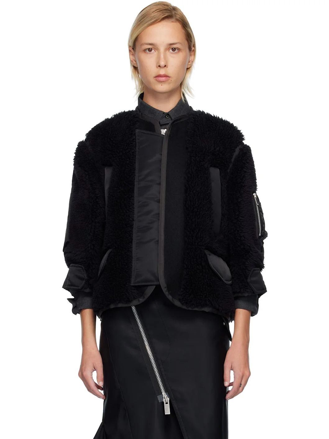 Insulated wool-blend fleece and nylon twill jacket. · Grosgrain trim throughout · Round neck · Concealed two-way zip closure with press-stud placket · Welt pockets at chest · Flap pockets at waist · Utility pocket and pen slots at sleeve · Press-stud tab at cuffs · Full twill lining Supplier color: Black Body: 50% wool, 28% acrylic, 22% polyester. Trim 1: 100% nylon. Trim 2: 100% wool. Fill: 100% polyester. Lining: 100% polyester. Made in Japan 252445F063015