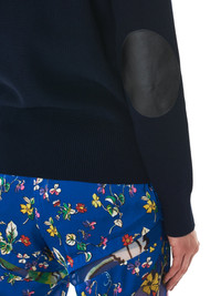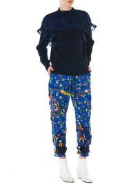 Sacai roll collar pullover sweater in navy blue, floral lace chiffon cowl, rib-knit cuffs and hem, and tonal stitching. Made in Japan. Model wears a size 2.