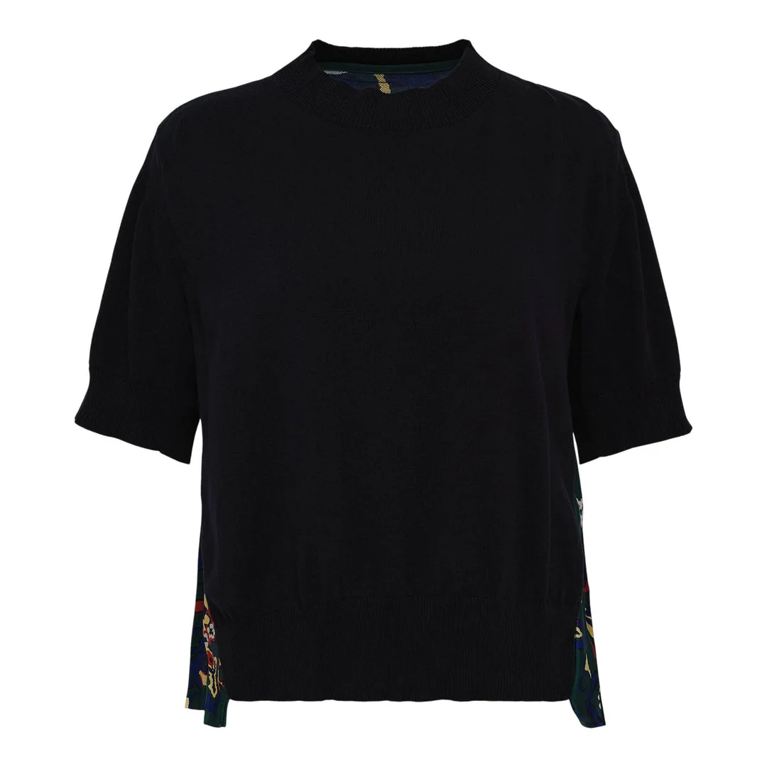 600070008NVY001 / 25-07987/00/213 - Round neckline with ribbed collar - Short sleeves with ribbed cuffs - Floral print contrast panels - Relaxed pullover fit - Premium knit construction - Signature sacai layered design The sacai Floral Print Pullover delivers innovative Japanese design with signature hybrid construction and contemporary styling. Crafted from premium knit fabric in classic black, featuring subtle floral print accents and the brand's distinctive layered aesthetic. The relaxed fit silhouette and architectural detailing create a modern statement piece that bridges streetwear and luxury fashion.