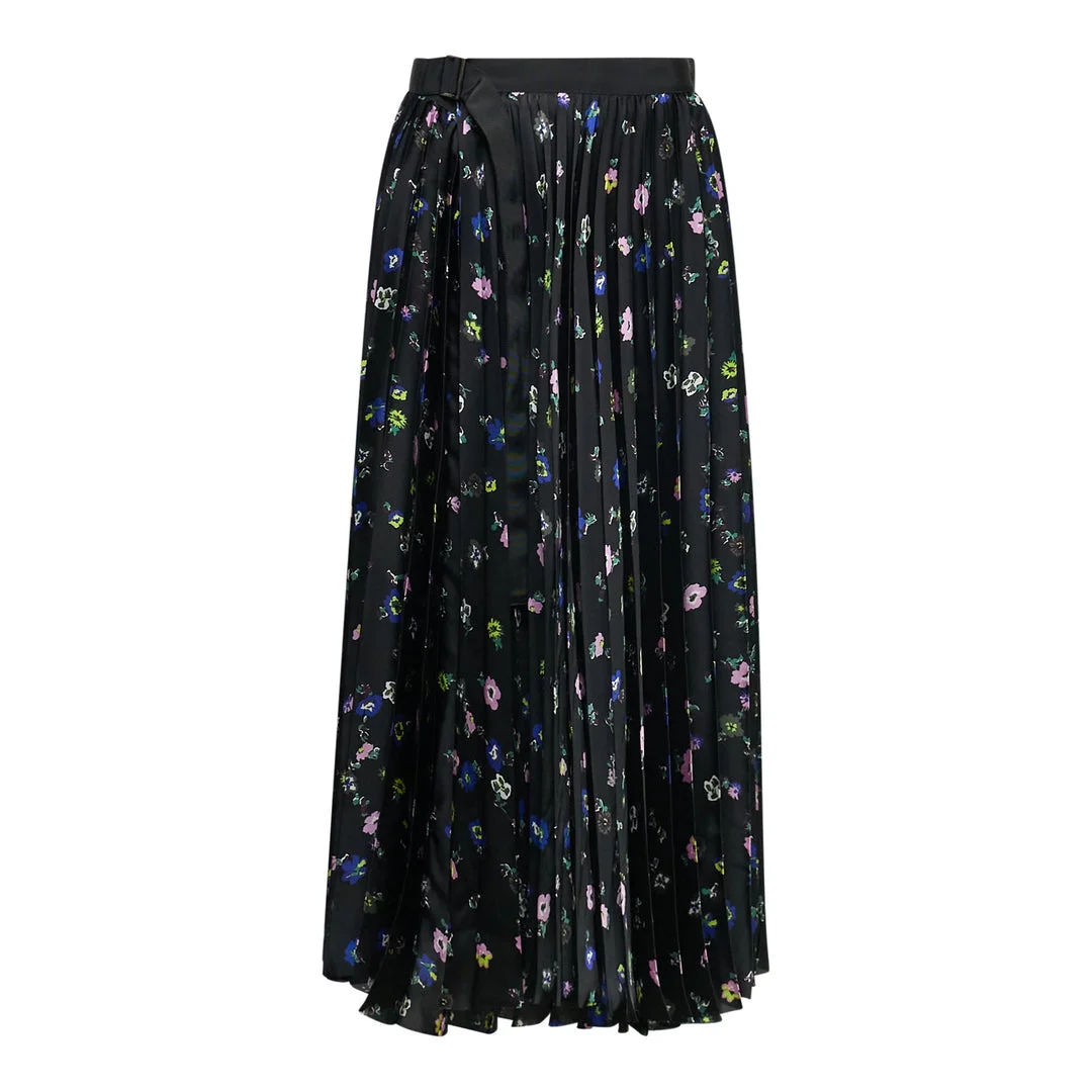 600078450BLK001 / 26-08386/00/001 - Elastic waistband with adjustable belt - Midi-length pleated silhouette - All-over scattered floral print - Lightweight flowing fabric - Regular fit - Unlined construction The sacai Floral Print Skirt delivers contemporary femininity with the brand's signature avant-garde aesthetic and Japanese craftsmanship. Crafted from lightweight pleated fabric in black with scattered colorful floral motifs throughout, featuring an elastic waistband for comfortable wear. The midi-length silhouette and distinctive pleated construction showcase sacai's innovative approach to modern wardrobe essentials.