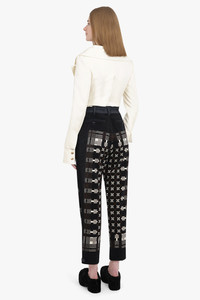 The Sacai Geometric Print Pants are crafted from cotton and are a tapered style, featuring a geometric print all over, belt loops, drawstrings, peating down the front and a slight drop crotch. Fabrication: 100% Cotton, 100% Polyester, 100% Cupro Size and Fit Sam: Model is 187cm/ 6’1” and is wearing a size JP2 Model Measurements: Bust: 91cm, Waist 76cm, Hips: 88cm Measurements Size 1: Waist 78cm, Hip 90cm, Length 102cm Size 2: Waist 82cm, Hip 94cm, Length 102cm Size 3: Waist 86cm, Hip 98cm, Length 102cm Size 4: Waist 90cm, Hip 102cm, Length 102cm