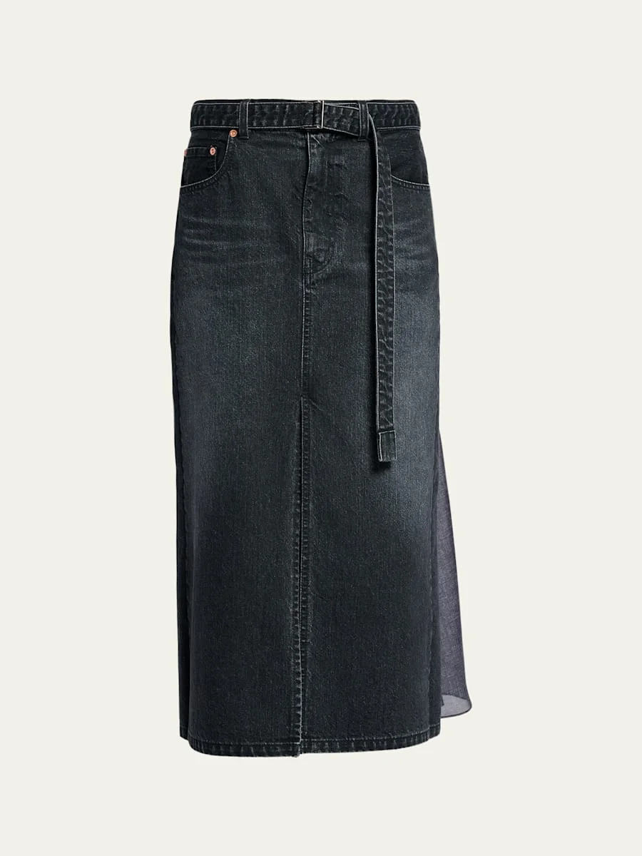 Crafted from faded graywashed denim, this skirt from SACAI features a selfbelt and contrast godets along the back High waist Fivepocket style Skirt falls straight from hip to hem Hem falls below the knee Centerfront slit hem Button/zip fly; belt loops Cotton/polyester Lining: Cupro Dry clean Made in Japan