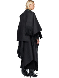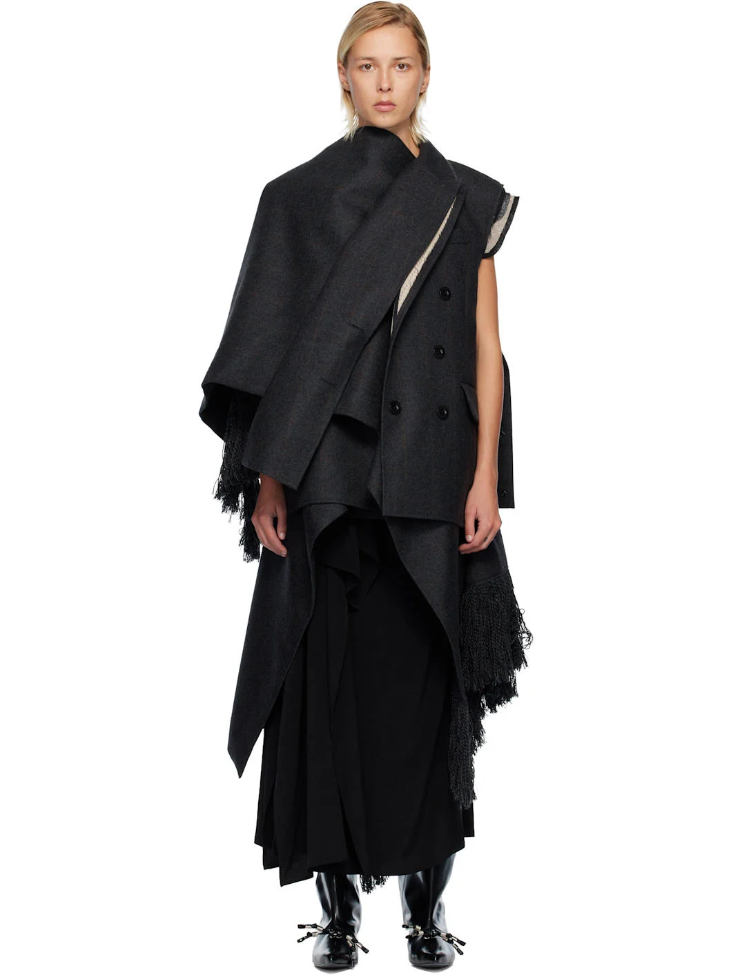 Double-faced wool melton vest. · Layered construction · Raw edges and check pattern throughout · Peaked lapels · Double-breasted button closure · Welt pocket at chest · Flap pockets at waist · Press-stud tabs at side seam · Fringed detailing at asymmetric hem Supplier color: Gray Body: 100% wool. Trim: 80% wool, 15% polyester, 3% acrylic, 1% rayon, 1% nylon. Lining: 56% rayon, 44% cupro. Made in Japan 252445F068001