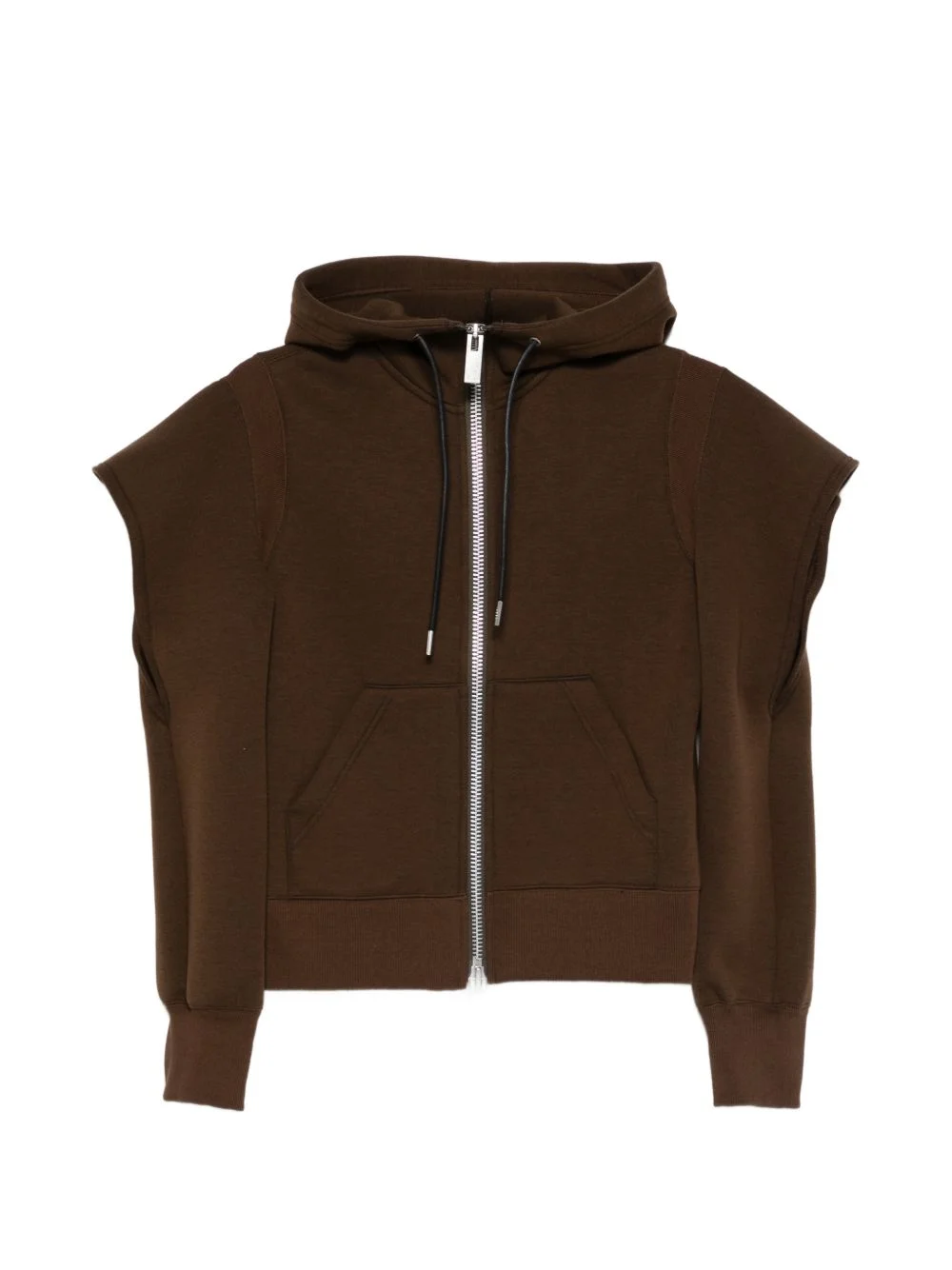 hooded zip hoodie Highlights - Brown - Drawstring hood - Front zip fastening - Front pouch pocket - Ribbed cuffs - Short sleeves Imported Composition Cotton 62%, Polyester 38% Washing instructions Dry Clean Only