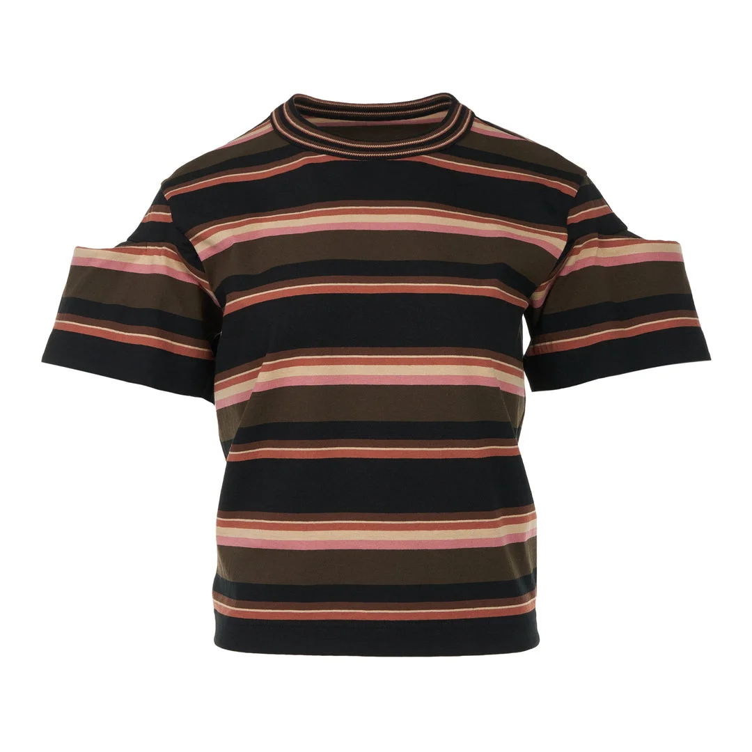 300050794KHA-01 / E626-08380/00/KHAKI PINK - Multi-tonal horizontal stripe pattern - Contrast ribbed crew neckline - Short sleeves - Premium cotton jersey construction - Structured fit - Japanese craftsmanship sacai Horizontal Stripe T-Shirt delivers contemporary Japanese design with sophisticated color-blocking and architectural construction. Crafted from premium cotton jersey featuring multi-tonal stripes in earthy tones of black, brown, coral, and pink with contrast ribbed neckline. The structured silhouette and signature sacai aesthetic create a refined statement piece for modern wardrobes.