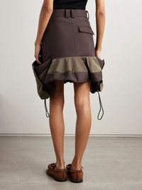 True to Sacai's signature aesthetic, this skirt features unexpected, innovative details - the draped, grosgrain-paneled hem is threaded with drawcords to change up the shape. It's made from scuba and has a sophisticated, tailoring-inspired waist. Wear yours with the matching jacket. Size & Fit - Size 1 = XS, 2 = S, 3 = M, 4 = L - Fits true to size, take your normal size - Mid-thigh length, designed to be worn at the waist - Drawcord hem for a flexible fit - Mid-weight, non-stretchy fabric - Model is 177cm/ 5'10" and is wearing the designer's size 1 Details & Care - Dark-brown scuba, army-green grosgrain - Snaps and concealed zip fastening at front