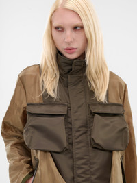 Khaki coat with nylon construction, defined by signature contrast paneling and quilted sections, cut with wide draping at the sides. Featuring: • Relaxed fit • Stand collar • Concealed placket closure • Long sleeves • Chest cargo pockets • Side pockets • Wide draping at sides • Made in Japan • 100% Nylon • Japanese sizing Model is 5'9" wearing size 1. Bust: 32" Waist: 25" Hips: 34"