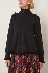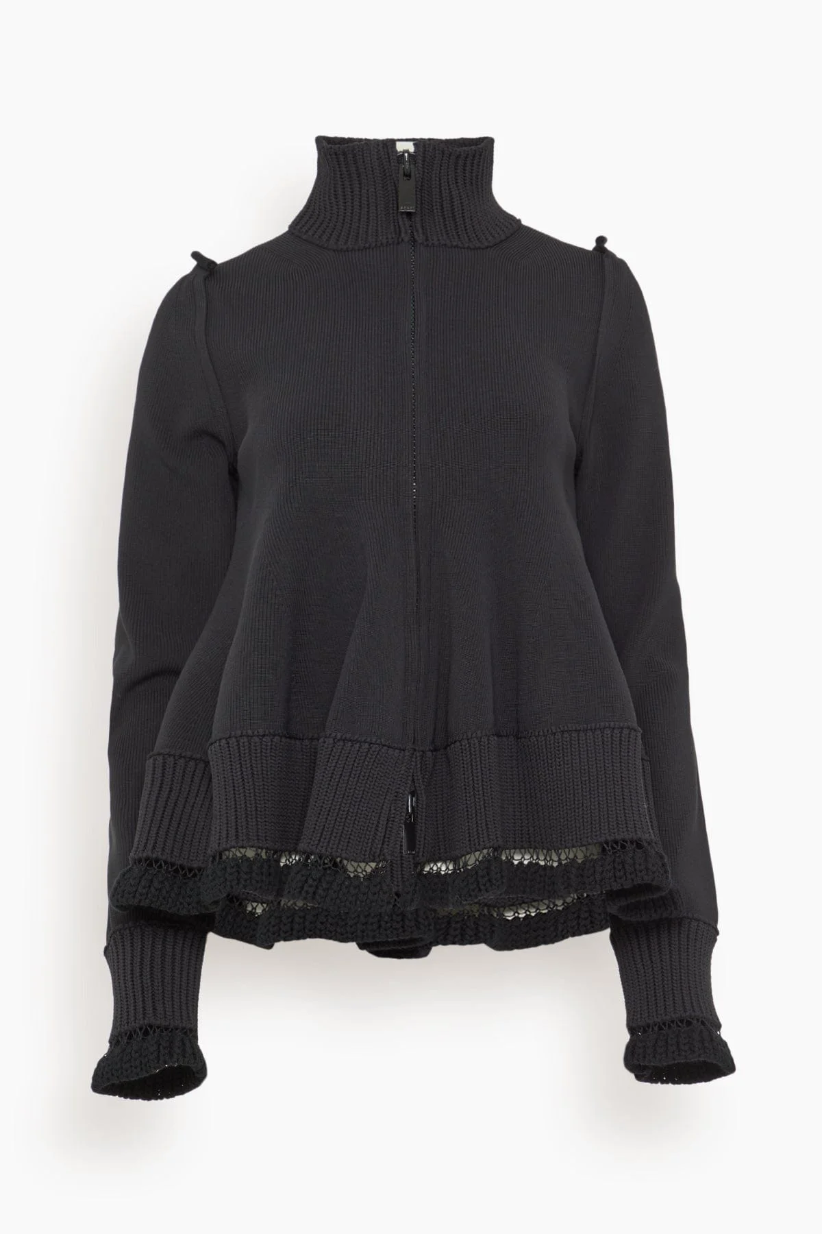 The Sacai Knit Blouson is a standout piece from their PreFall 25 Collection. This sweater features a dramatic ruffled hemline with a zip front and mock neckline. Wear yours with a skirt and boots. FIT DESCRIPTION MODEL MEASUREMENTS - Fits true to size, take your normal size - Sweater - Zip front - Mock neckline - Ruffled hemline - Harriet is wearing a size 1/ XS - Bust: 32" - Waist: 24" - Hips: 30.5" - Height: 5’8.5”