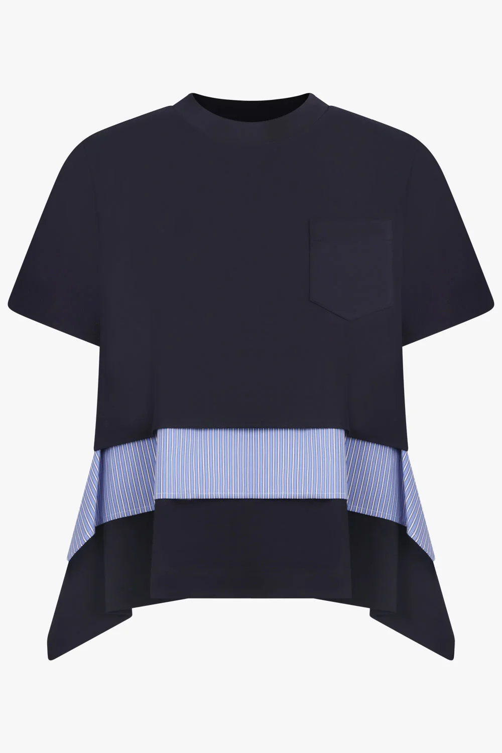 A modern wardrobe essential, the Sacai Layer S/S Top With Attached Shirting Panels in Navy/Blue captures the brand’s artful blend of fluidity and tailoring. Crafted from a premium cotton blend, this top features a layered design with attached shirting panels that add dimension and movement to the silhouette. The navy and blue tones offer versatility, while the relaxed fit ensures comfort without compromising on style. - Fabrication: 100% Cotton - Premium cotton-blend construction with a soft, breathable feel - Attached shirting panels add dimension and a layered aesthetic - Relaxed fit with a classic crew neckline for everyday wearability - Navy/blue colourway for versatile styling options Style it with tailored trousers or a skirt for a modern, sophisticated silhouette. Size and Fit Tiah: Model is 178cm/5’9” and is wearing a size JP1 Model Measurements: Bust: 86cm, Waist: 69cm, Hips 90.5cm Fits true to size Measurements Size 1: Bust 98cm, Waist 98cm, Hip 98cm, Length 62cm Size 2: Bust 100cm, Waist 100cm, Hip 100cm, Length 62cm Size 3: Bust 102cm, Waist 102cm, Hip 102cm, Length 62cm Size 4: Bust 110cm, Waist 110cm, Hip 110cm, Length 62cm