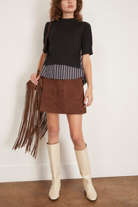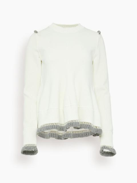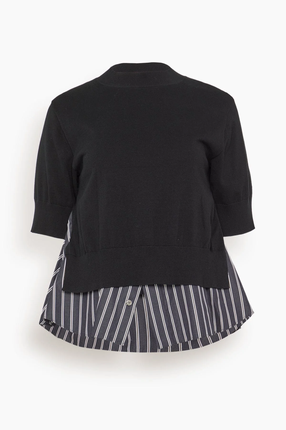 The Sacai Poplin x Knit Pullover features their signature silhouette. You'll love the mix of the striped cotton underlay with the knit bodice. Wear yours with jeans and flats. FIT DESCRIPTION MODEL MEASUREMENTS - Fits true to size, take your normal size - Short sleeve sweater - Cotton underlay - Relaxed fit - Knit bodice - 100% cotton - Mya is wearing a size 1/ XS - Bust: 32" - Waist: 25" - Hips: 34" - Height: 5’9"