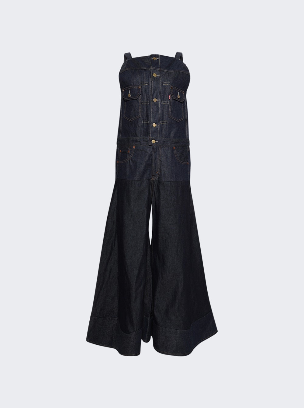 Details - Designed in collaboration with Levi's - Denim slouchy fit jumpsuit - Bib-style top with camisole straps - Wide flared legs with 5-pocket detailing - Paneling on pants for an elegant drape - Material: 100% Cotton Size Information: Vendor Color Code: Brand Style: 25-07782 Designer/Brand: SACAI