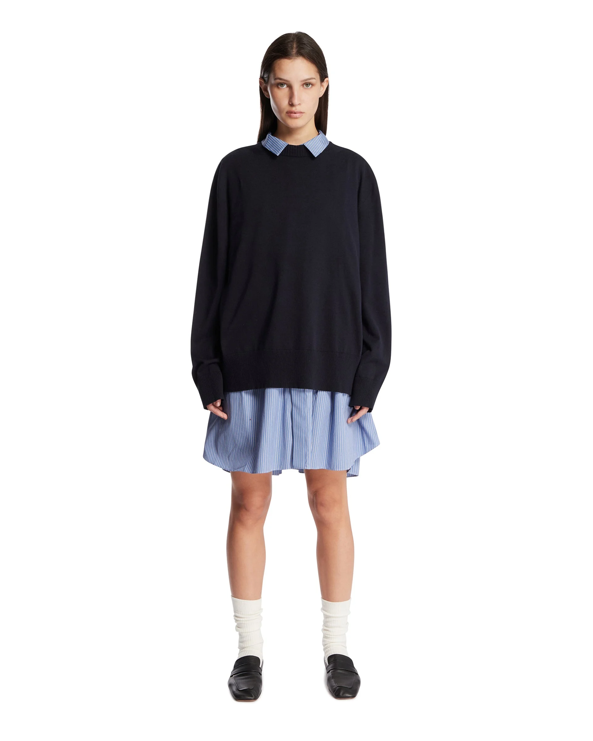 Sacai Light Blue and Blue Cotton and Knit Dress. Double construction with a sleeveless light blue shirt and an overlaid blue long-sleeve knit. Classic collar, knit with back slit and button closure. Flared hem, relaxed fit. Laimitri is 177 cm and she is wearing a size III. DETAILS Model: 2508169239 Composition: 100% Cotton; Details: 100% Polyester Made in: JAPAN Season: FW25-26