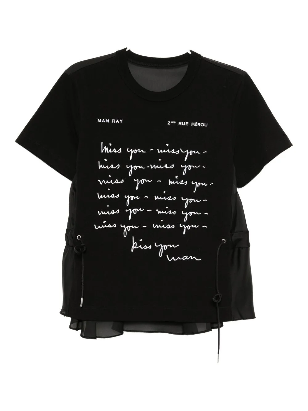 script-printed blouse Highlights - Black - Drawstring waist - Short sleeves - Semi-sheer panels Imported Composition Cotton 100% SIZE & FIT Model measurements Height 5 ft 10 in(1.78 m) Bust/Chest 31.88 in(81 cm) Hips 37 in(94 cm) Waist 25.19 in(64 cm) FittingInformation Designed to be unstructured, offering a loose fit throughout The adjustable drawstring means that you can adjust this piece’s fit to suit your comfort and preference Made from a midweight fabric Washing instructions Dry Clean Only