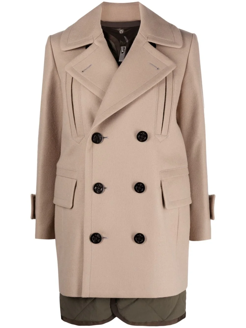 Melton layered wool coat Highlights - Beige/khaki - Wool - Layered design - Notched lapels - Double-breasted button fastening - Front zip fastening - Long sleeves - Two slit pockets at the chest - Two side flap pockets - Straight hem Imported Composition Outer: Polyester 100% Lining: Polyester 100%, Nylon 100% SIZE & FIT Model measurements Height 5 ft 11 in(1.8 m) Bust/Chest 31.49 in(80 cm) Hips 35.82 in(91 cm) Waist 24.8 in(63 cm) FittingInformation Designed to be unstructured, offering a loose fit throughout The detachable panel offers the preference for a different fit Made from a midweight non-stretch fabric This piece fits true to size – take your usual size Washing instructions Dry Clean Only