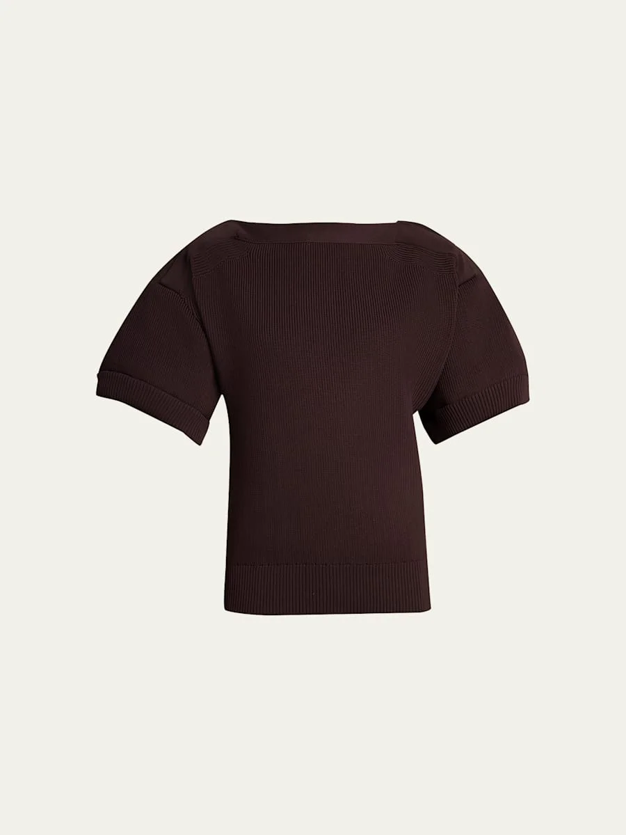 Crafted from English ribbed knit, this sweater from SACAI features cotton twill shoulder patches on the back and an asymmetric neckline with buttons Offtheshoulder neckline Short puff sleeves Loose fit Ribbed cuffs and hem Pullover style Polyester/cotton Dry clean Made in Japan