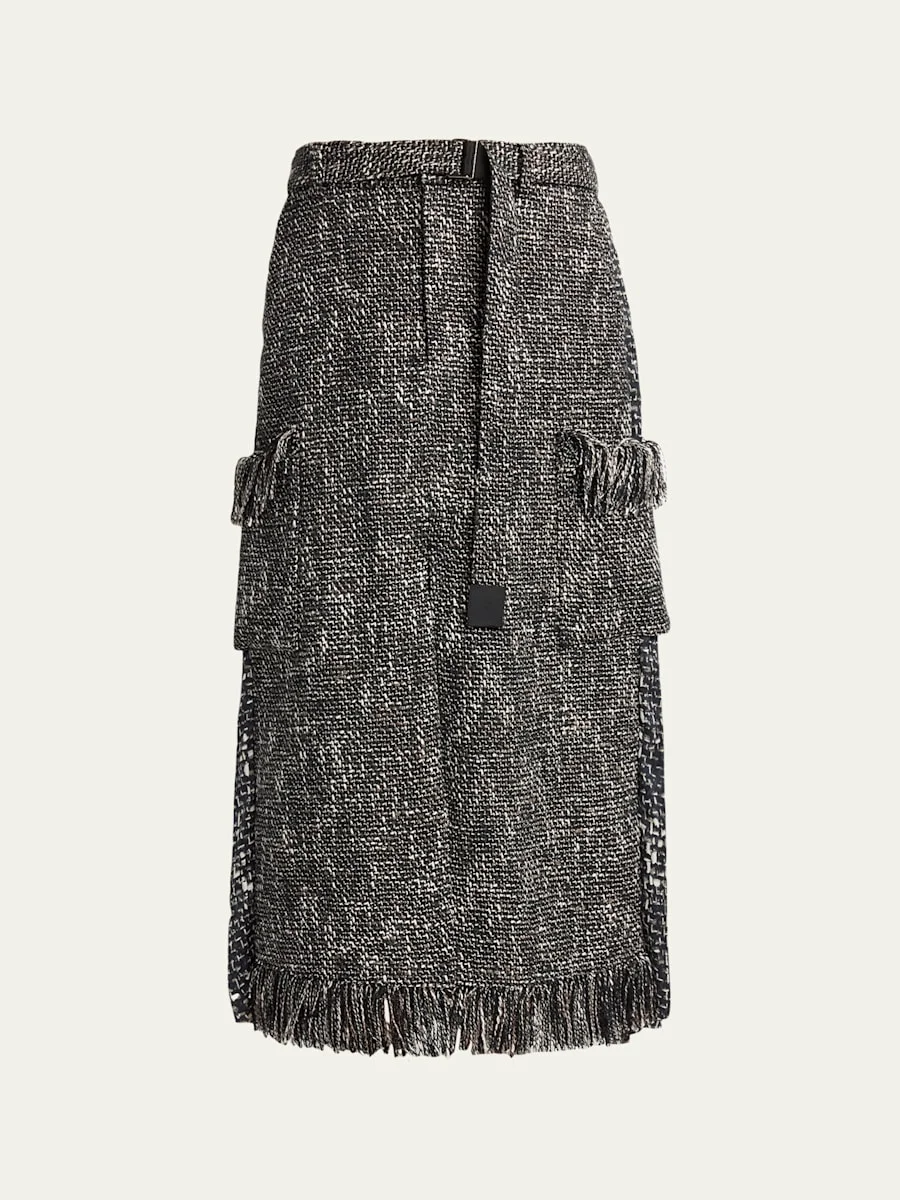 Mixed-Media Tweed Belted Midi Skirt