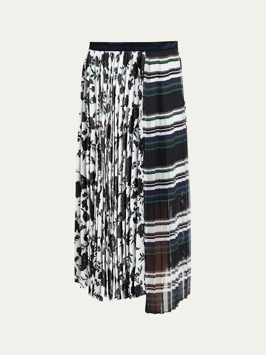 Crafted from satin and sheer georgette, this skirt from SACAI is finished with pleating, patchwork multi prints, and an asymmetric hem High waist Aline silhouette Hem falls below the knee Invisible side zip Polyester Lining: Cupro Dry clean Made in Japan