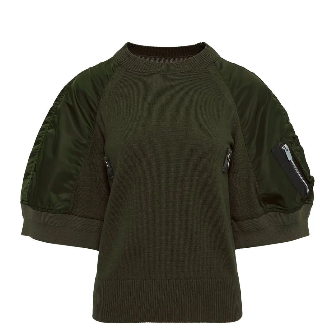 600078419BRN001 / 26-08310/00/601 - Mixed-material construction - Cotton knit front panel - Nylon twill sleeves - Utility zip pockets on sleeves - Ribbed crew neckline - Ribbed cuffs and hem - Relaxed fit sacai Nylon Twill x Knit Pullover delivers hybrid construction combining technical nylon sleeves with soft knit body. Crafted from premium olive green cotton knit front panel with contrasting nylon twill sleeves, featuring signature sacai mixed-material aesthetic. The architectural silhouette and utility zip details create a distinctive piece that bridges athletic and contemporary fashion.
