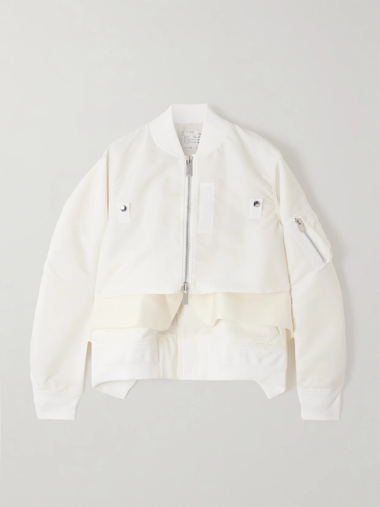 Sacai re-imagines the classic bomber jacket through its signature deconstructed lens. Made from panels of durable shell and tactile wool for contrast, it has a layered design with a partial zipper and flexible ribbed trims.