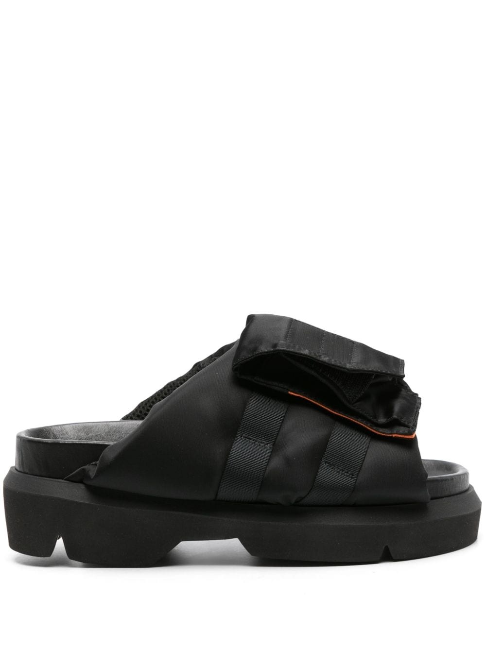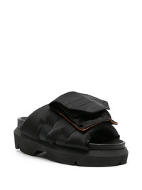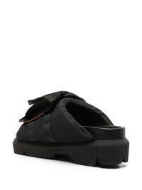 padded chunky slides Highlights - Jet black - Padded design - Grosgrain ribbon trim - Round open toe - Front flap pocket - Open back - Branded moulded footbed - Segmented chunky rubber sole - Slip-on style - This piece comes complete with a protective dust bag. Imported Composition Outer: Nylon 100% Sole: Rubber 100% SIZE & FIT Measurement HEEL 1.77 in(4.5 cm) Sole height 1.37 in(3.5 cm)