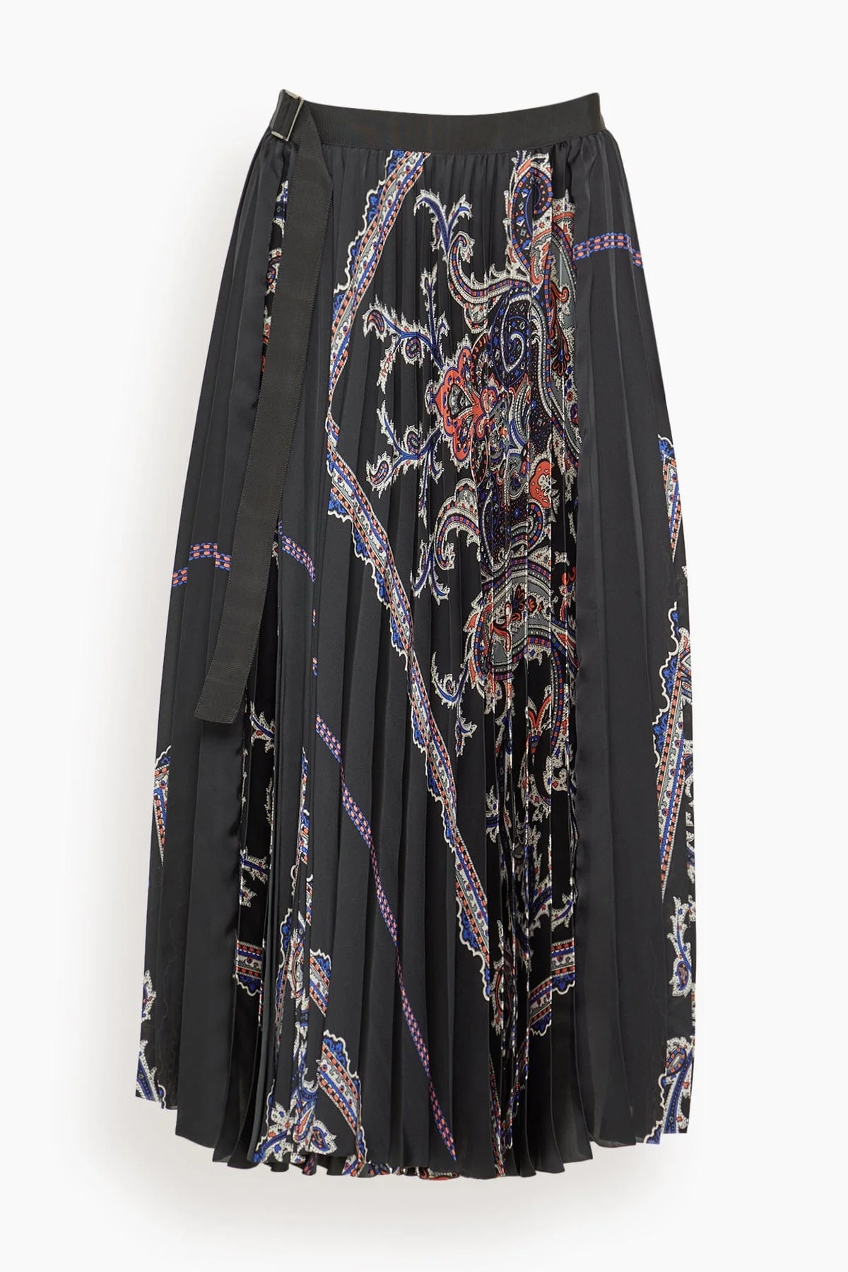 The Sacai Paisley Print Skirt is a must-have piece from their Fall 25 Collection. This midi skirt features allover pleating in a paisley print. Wear yours with a sweater and boots. FIT DESCRIPTION MODEL MEASUREMENTS - Fits true to size, take your normal size - Midi length - Allover pleating - High rise - Belt - POLYESTER 70% WOOL 30% - Celeste is wearing a size 1/ XS - Bust: 35" - Waist: 25.5" - Hips: 34" - Height: 5’10”