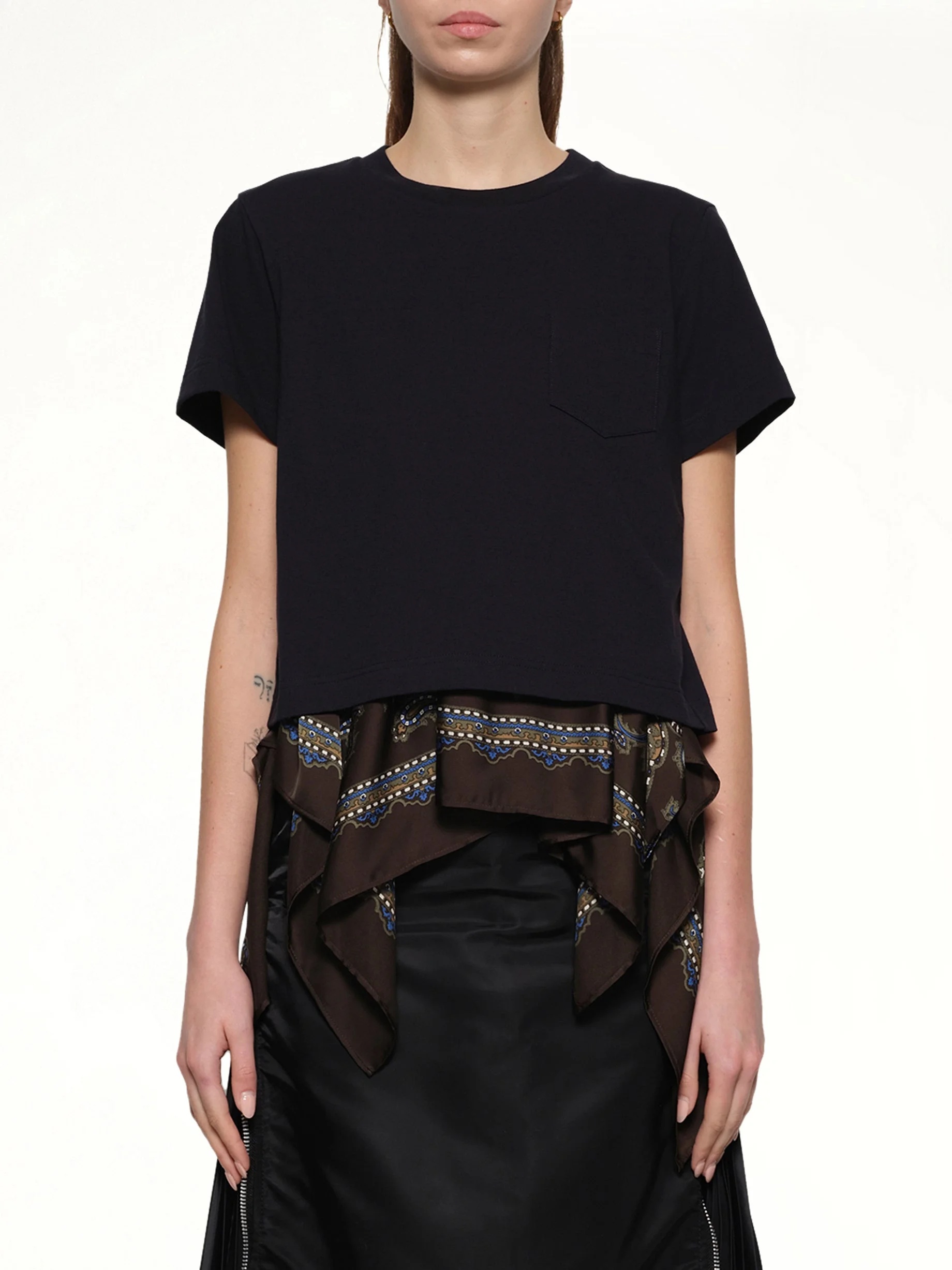 Sacai's Paisley Print x Cotton Jersey T-Shirt in Navy/Khaki is a stylish blend of classic patterns and modern design. This versatile piece is perfect for adding a touch of sophistication to any casual outfit. - Composition: Cotton 100%, Attached Parts:Polyester 100% - Features a unique paisley print design - Crafted in a comfortable cotton jersey fabric - Available in a navy and khaki color combination - Designed with a relaxed fit for everyday wear - Ideal for layering or wearing on its own - Made in - Model is 178 cm and wears size 1 SKU: 2508149 212