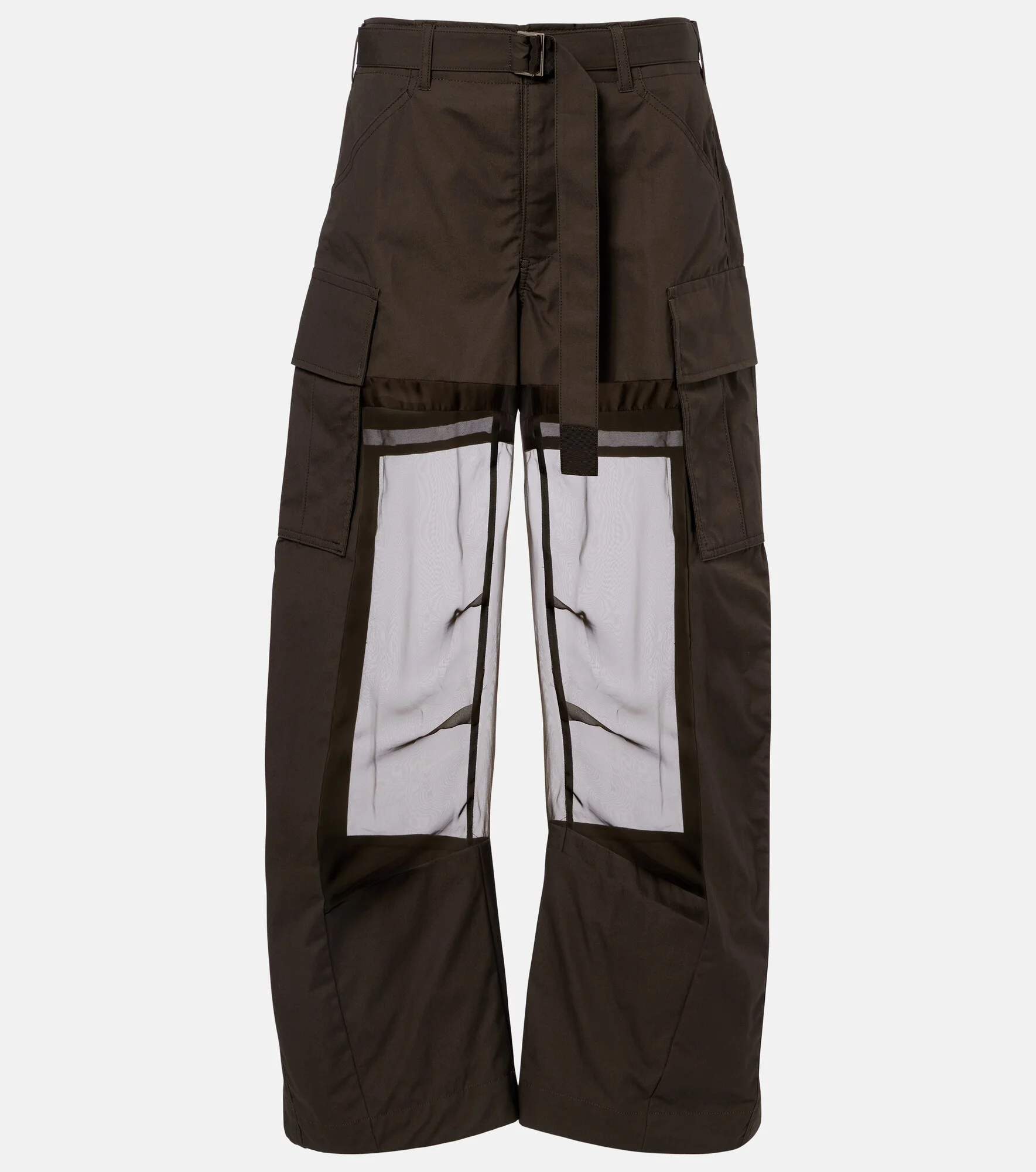 Sacai’s penchant for hybrid designs sees contrasting textures, fabrics, and techniques combined to create entirely unique and innovative styles. Made from cotton, these cargo pants feature sheer panels at the front and are complete with a detachable belt. Product Details - Material: 100% cotton - Care instructions: dry clean - Made in Japan - Color: green - Designer color name: D/Khaki - Material II: 100% polyester - Lining: 100% cupro - Detachable and adjustable belt - Belt loops - Pockets: slant pockets, cargo pockets, back pockets - Item number: P01150928 Size & Fit - True to size - Adjustable at the waist - Non-stretchy fabric - Wide-leg - The model seen in the picture is 178cm-5'10" and wearing a size 0