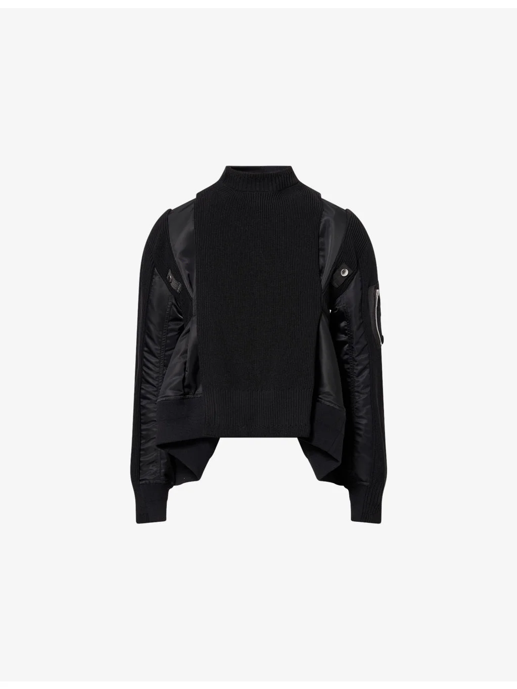 PRODUCT DETAILS - Sacai cotton-blend jacket - 52% cotton, 46% polyester, 1% polyamide, 1% polyurethane - Concealed zip fastening at front - Regular fit, mock-neck, long sleeves, zip pocket at sleeve, side welt pockets, panelled, asymmetric hem - Dry clean - Made in Japan - True to size - Size small: length 21in / 53cm - Model is 5ft 10in/1.78m and wears a size small - Midweight, non-stretch Ref: R04610039