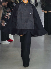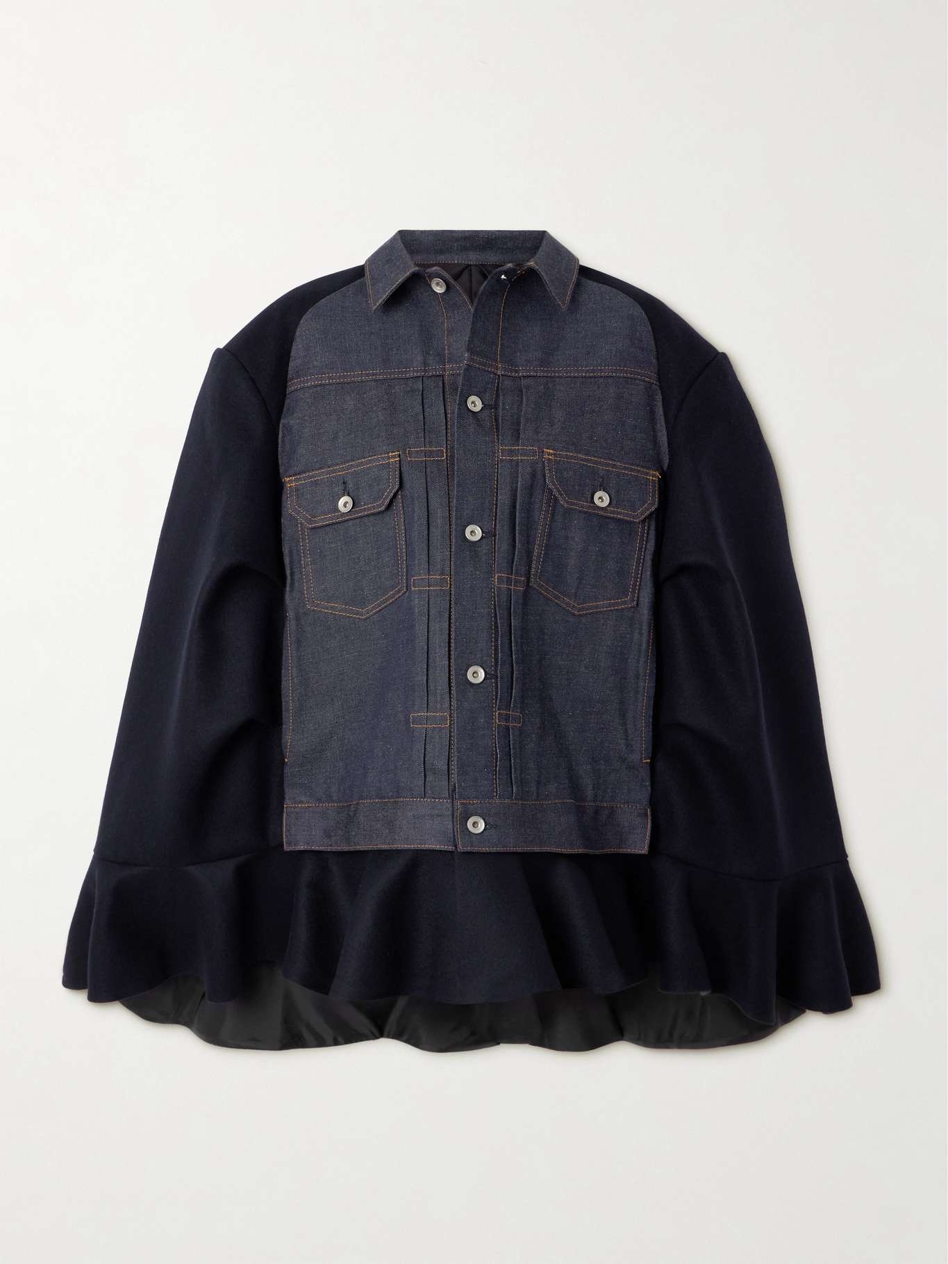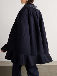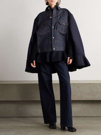 EDITORS'NOTES Sacai's Chitose Abe has been creating hybridized designs for 25 years, and her creative ideas are still ever-flowing. This cape from the Fall '24 collection is made from a combination of wool-felt and panels of denim that look as though they've been borrowed from a classic trucker jacket. The ruffled hem adds femininity and beautiful movement. SIZE & FIT Model measurements: - Size 1 = XS, 2 = S, 3 = M, 4 = L - Fits true to size, take your normal size - Designed for a loose fit - Weighted, non-stretchy fabric - Model is 180cm/ 5'11" and is wearing the designer's size 2 - Bust: 81cm/ 32" - Waist: 63cm/ 25" - Hip: 91cm/ 36" - Length: 81cm / 31.9in DETAILS & CARE - Dark-navy wool-felt, indigo denim - Button fastenings through front - 100% wool; trim: 100% cotton; lining: 100% cupro - Dry clean