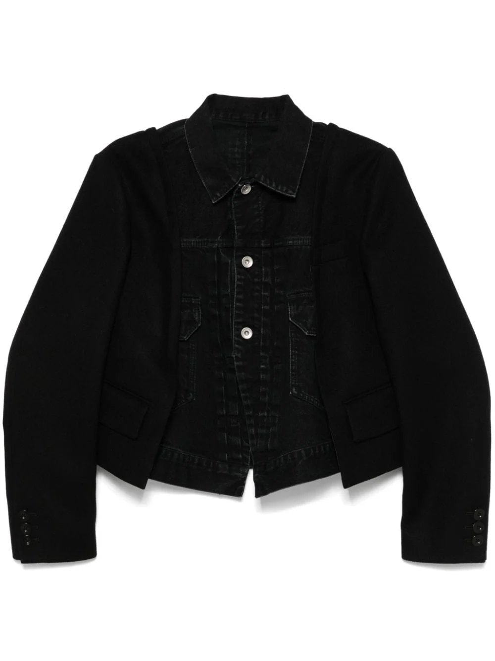 panelled jacket Highlights - Black - Cotton/wool - Washed denim - Felted - Panelled design - Front button fastening - Classic collar - Long sleeves - Buttoned cuffs - Faux pocket detail - Two side flap pockets - Front slits - Rear slits - Partial lining - Straight hem - Cropped Imported Composition Outer: Cotton 100%, Wool 100% Lining: Cupro 100% SIZE & FIT Model measurements Height 5 ft 11 in(1.8 m) Bust/Chest 32.67 in(83 cm) Hips 36.22 in(92 cm) Waist 24.4 in(62 cm) FittingInformation Designed to be unstructured, offering a loose fit throughout Made from a midweight non-stretch fabric