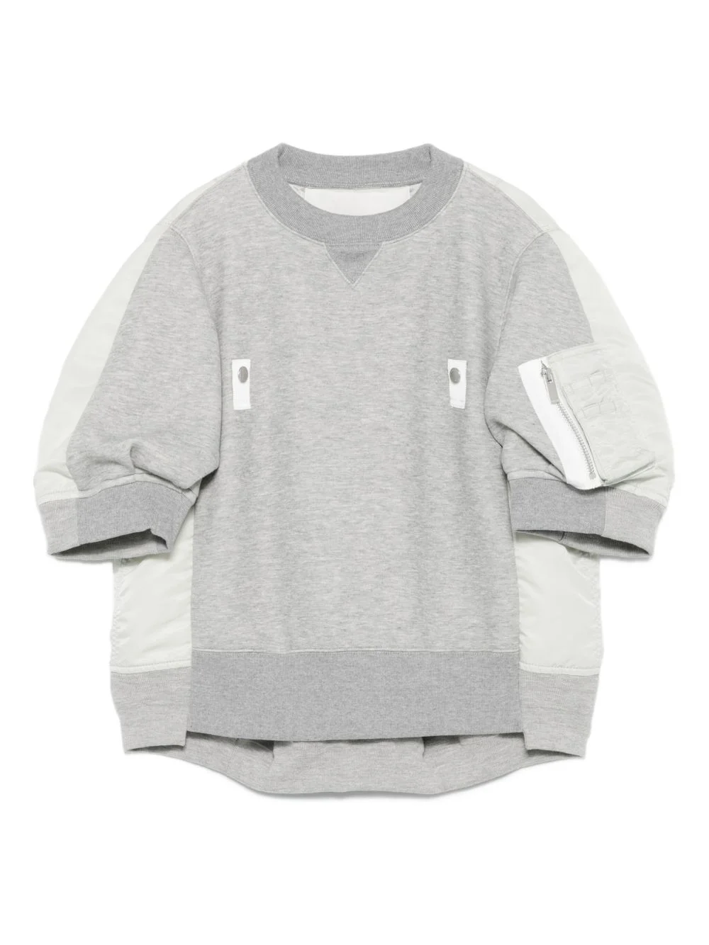 panelled zip-fastening sweatshirt Highlights - Grey - Nylon panel - Zip fastening - Short sleeves - Button embellishments Imported Composition Nylon 100%, Cotton 62%, Polyester 38% SIZE & FIT Model measurements Height 5 ft 9 in(1.75 m) Bust/Chest 34.64 in(88 cm) Hips 36.61 in(93 cm) Waist 26.37 in(67 cm) Washing instructions Dry Clean Only