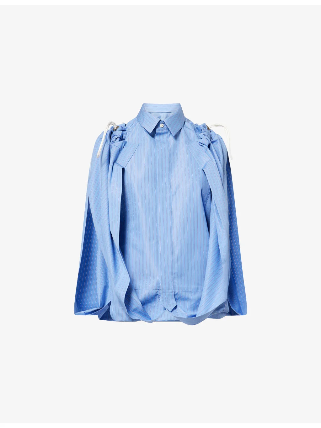 PRODUCT DETAILS - Sacai cotton-blend shirt - 75% cotton, 25% polyester - Button fastening - Cropped boxy fit, classic collar, sleeveless, adjustable-toggle drawstring at shoulders, covered placket at front, draped layer at sides, all-over pinstripe - Dry clean - Made in Japan - True to size - Model is 5ft 10in/1.78m and wears a size small - Lightweight, non-stretch Ref: R04610045