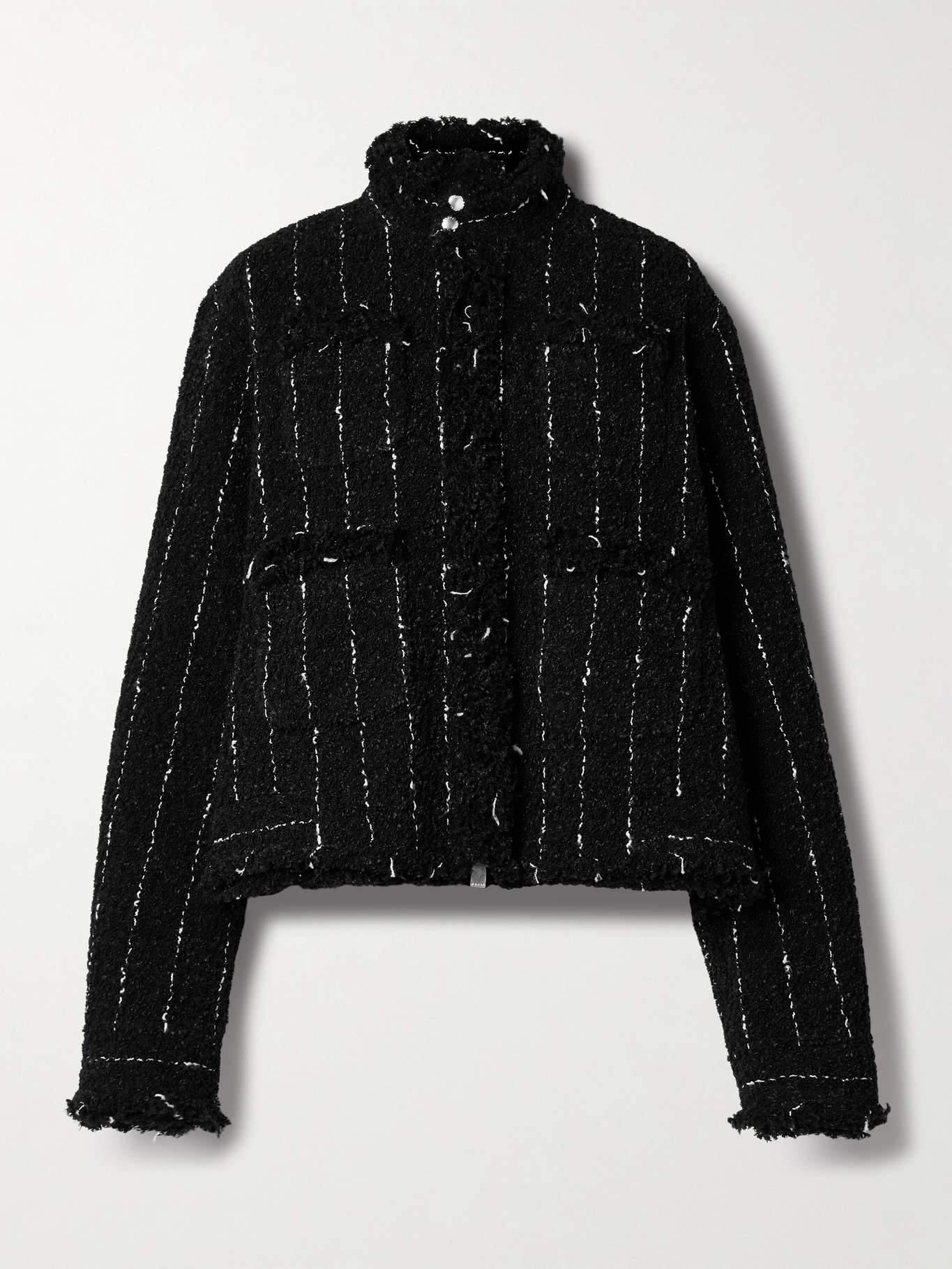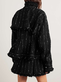 EDITORS'NOTES Sacai's jacket is made from black boucle that's detailed with the same contrasting pinstripes as the coordinating shorts in our edit. Designed for a slightly relaxed fit, it has frayed edges and a funnel neckline that's adjustable by silver-tone snap fastenings. The satin lining ensures a smooth fit. SIZE & FIT Model measurements: - Size 1 = XS, 2 = S, 3 = M, 4 = L - Fits true to size, however those who are between sizes should take the smaller size - Designed for a relaxed fit - Long in the sleeves - Mid-weight, non-stretchy fabric - Model is 177cm/ 5'10" and is wearing the designer's size 2 - Bust: 79cm/ 31" - Waist: 61cm/ 24" - Hip: 85cm/ 33.5" DETAILS & CARE - Black and white boucle - Snap and concealed zip fastening at front - 67% nylon, 33% cotton; trim: 60% cotton, 40% nylon; lining: 100% cupro