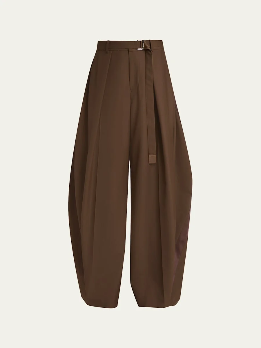 Crafted from woolblend suiting, these pants from SACAI feature front and back pleats and a self belt High rise Side slip pockets Back welt pockets Curved barrel legs Full length Hook/zip lfy; belt loops Polyester/wool/cupro Dry clean Made in Japan