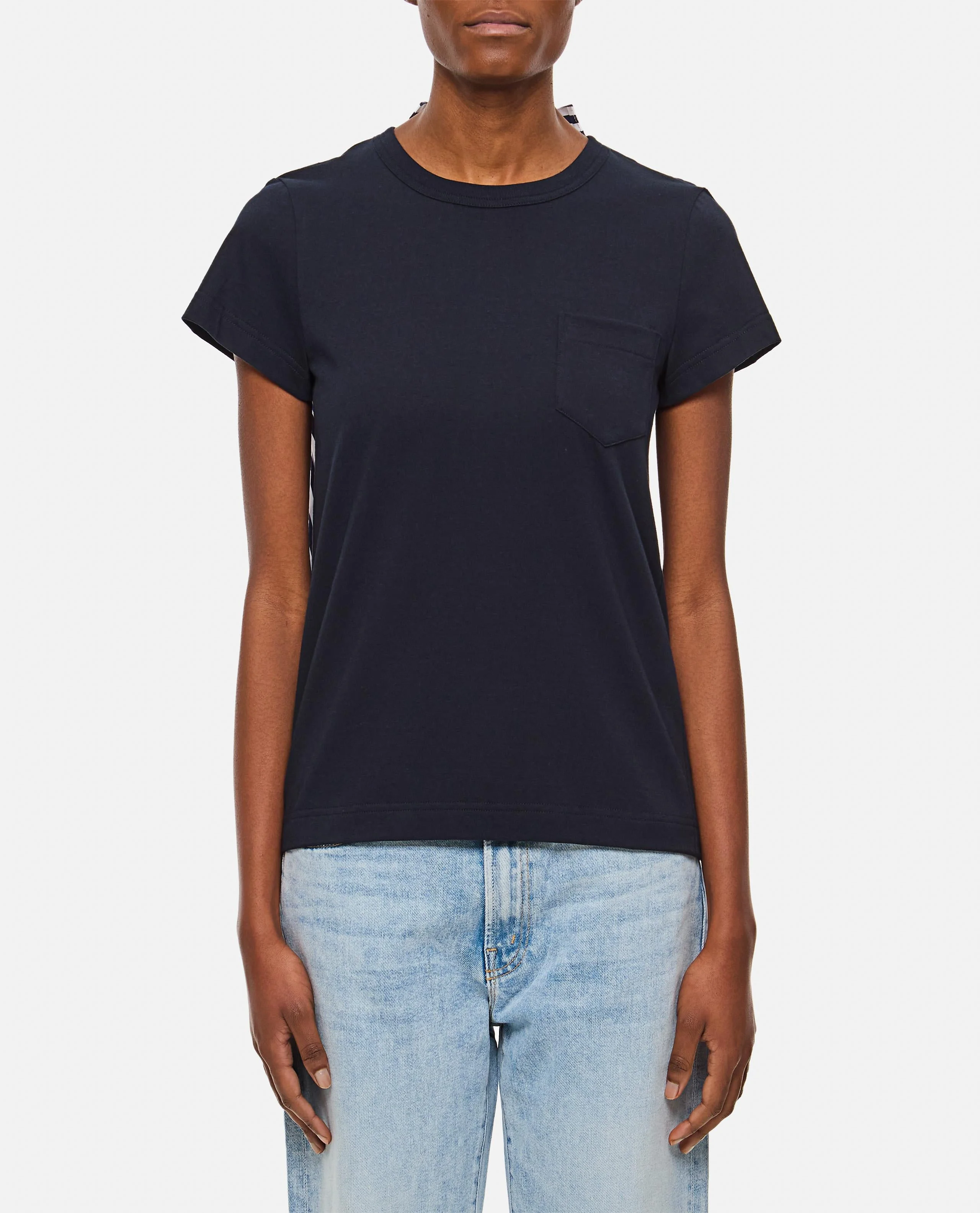 Hybrid T-shirt combining a cotton jersey base with poplin inserts. Back and side panels in striped poplin with pleated detailing. Asymmetric design, voluminous silhouette. Ribbed crew neck and short sleeves. Applied chest pocket. Color: Navy / White Details and Care Color: Blu Composition: 100% CO Made in: Giappone Sku: SCW352240