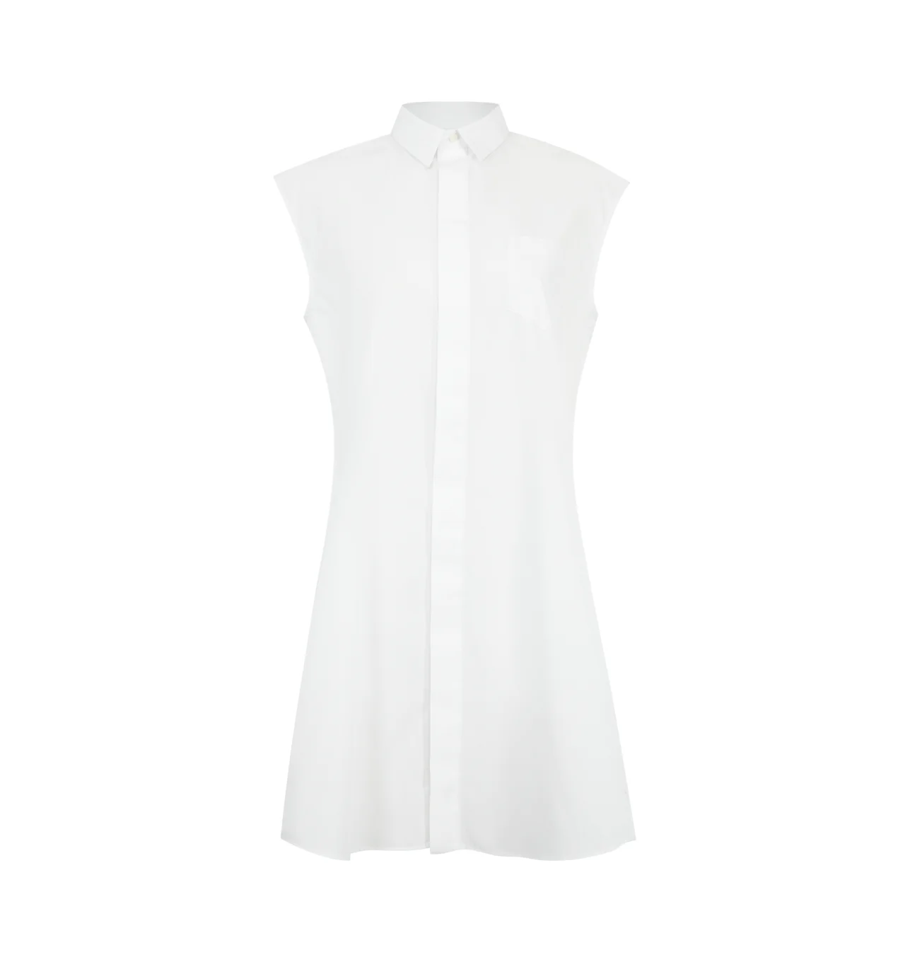 SACAI Poplin Dress featuring concealed front button closure, sleeveless, collared neck, mini length and pleated at the back. Cotton. Made in Japan. DESIGNER STYLE ID: 26-08482 COLOR: 151 OFF WHITE