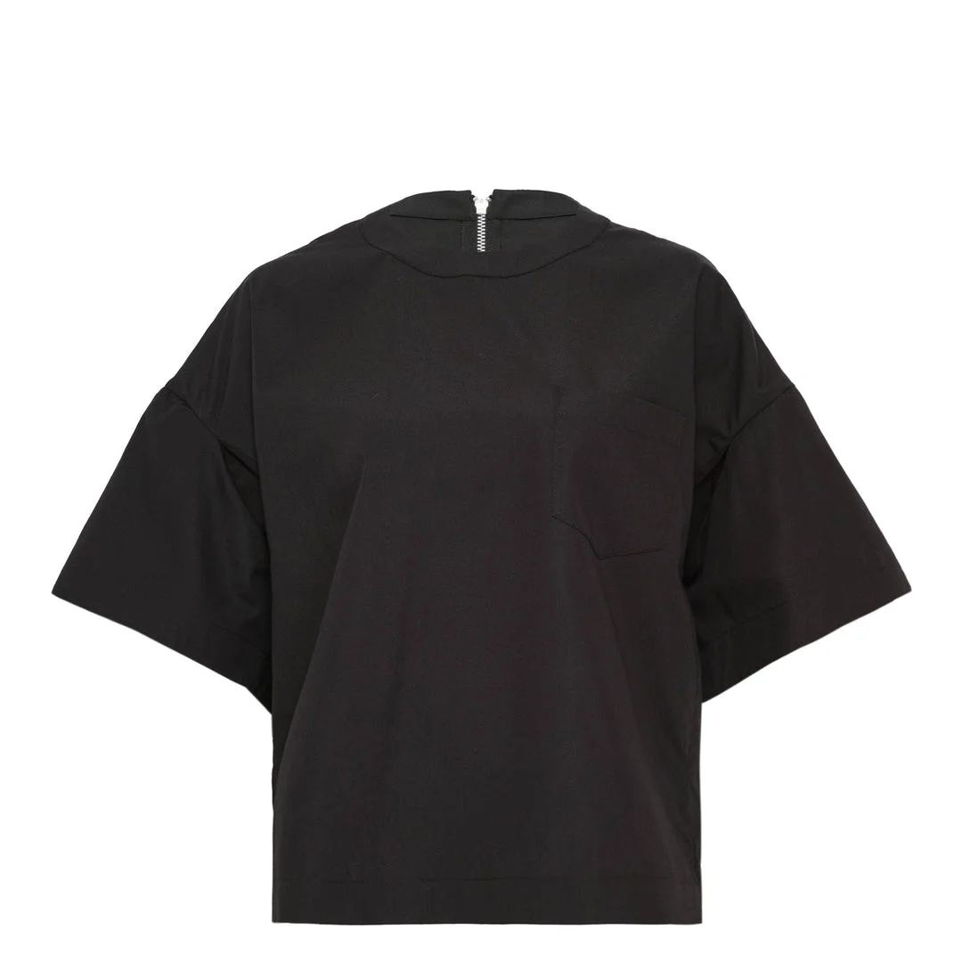 600078383BLK001 / 26-08396/00/001 - Cotton poplin construction - Back zip closure - Mock neck design - Short sleeves - Relaxed fit - Structured shoulder construction The sacai Poplin Pullover delivers contemporary sophistication with innovative design elements and precise construction. Crafted from crisp cotton poplin in classic black, featuring the brand's signature architectural silhouette with structured shoulders and relaxed fit. The minimalist aesthetic and premium fabric hand create a versatile statement piece that bridges casual and refined styling.