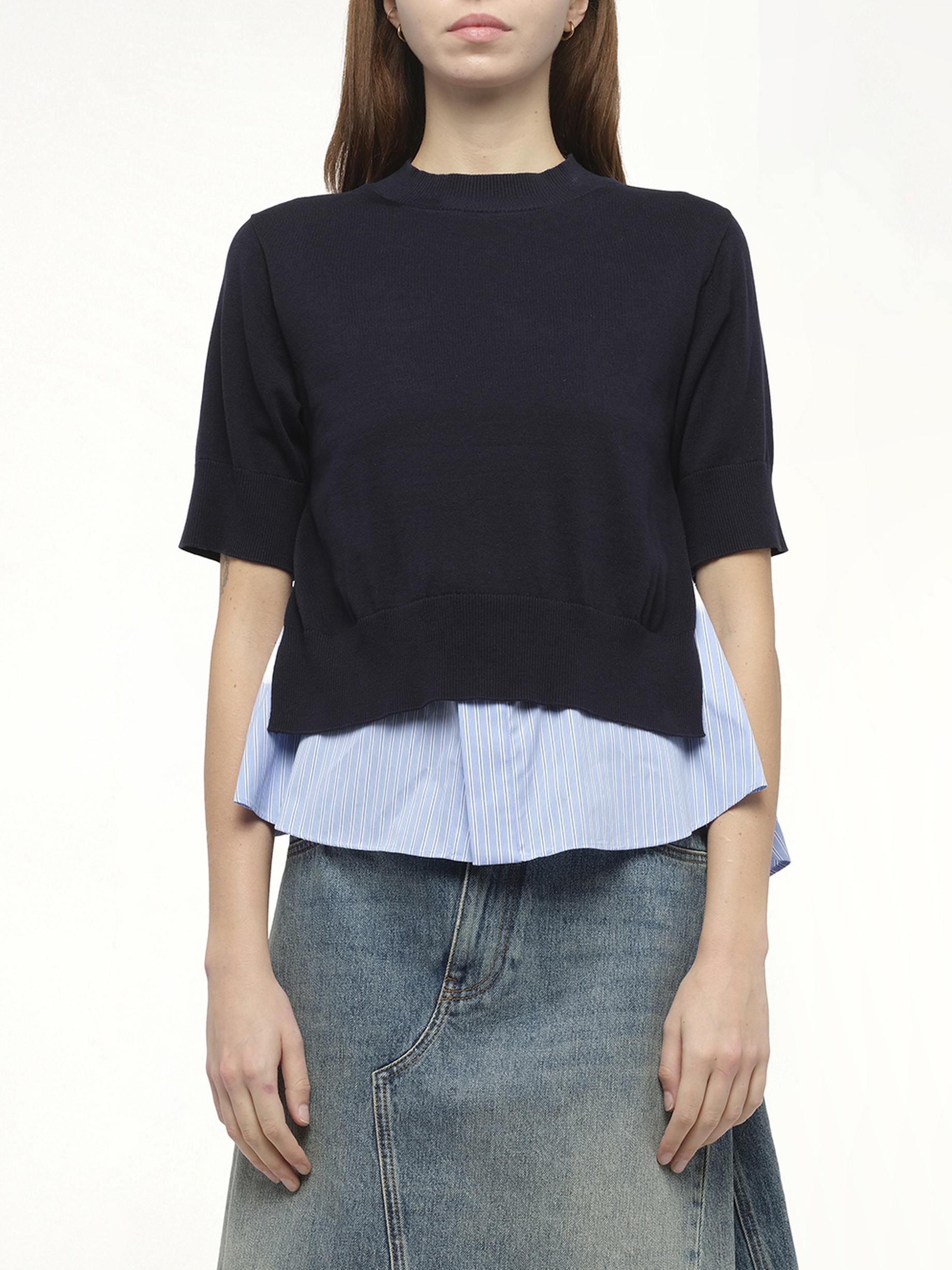 SACAI's Poplin x Knit Pullover in Navy/Light Blue Stripe is a unique blend of textures and patterns, offering a modern twist on a classic silhouette. This versatile piece effortlessly combines comfort and style, making it a standout addition to any wardrobe. - Composition: Cotton 100%, Attached Parts:Polyester 65%, Cotton 35%, Polyester 100% - Contrasting poplin and knit design - Elegant navy and light blue stripe pattern - Relaxed fit for everyday wear - Perfect for layering or as a statement piece Model is 178 cm and wears size 1 SKU: 2508012 250