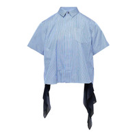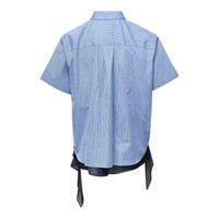600071807STR001 / 25-08166/00/421 - Blue and white striped poplin upper construction - Navy satin panel hem overlay - Short sleeve design - Point collar - Button-front closure - Contrasting fabric tie details at hem - Hybrid construction technique - Regular fit sacai Poplin x Satin Shirt delivers innovative fabric mixing with Japanese avant-garde craftsmanship. The hybrid construction combines structured blue striped poplin with flowing navy satin panels at the hem. Signature sacai hybrid design philosophy creates a unique silhouette that bridges formal and contemporary aesthetics.