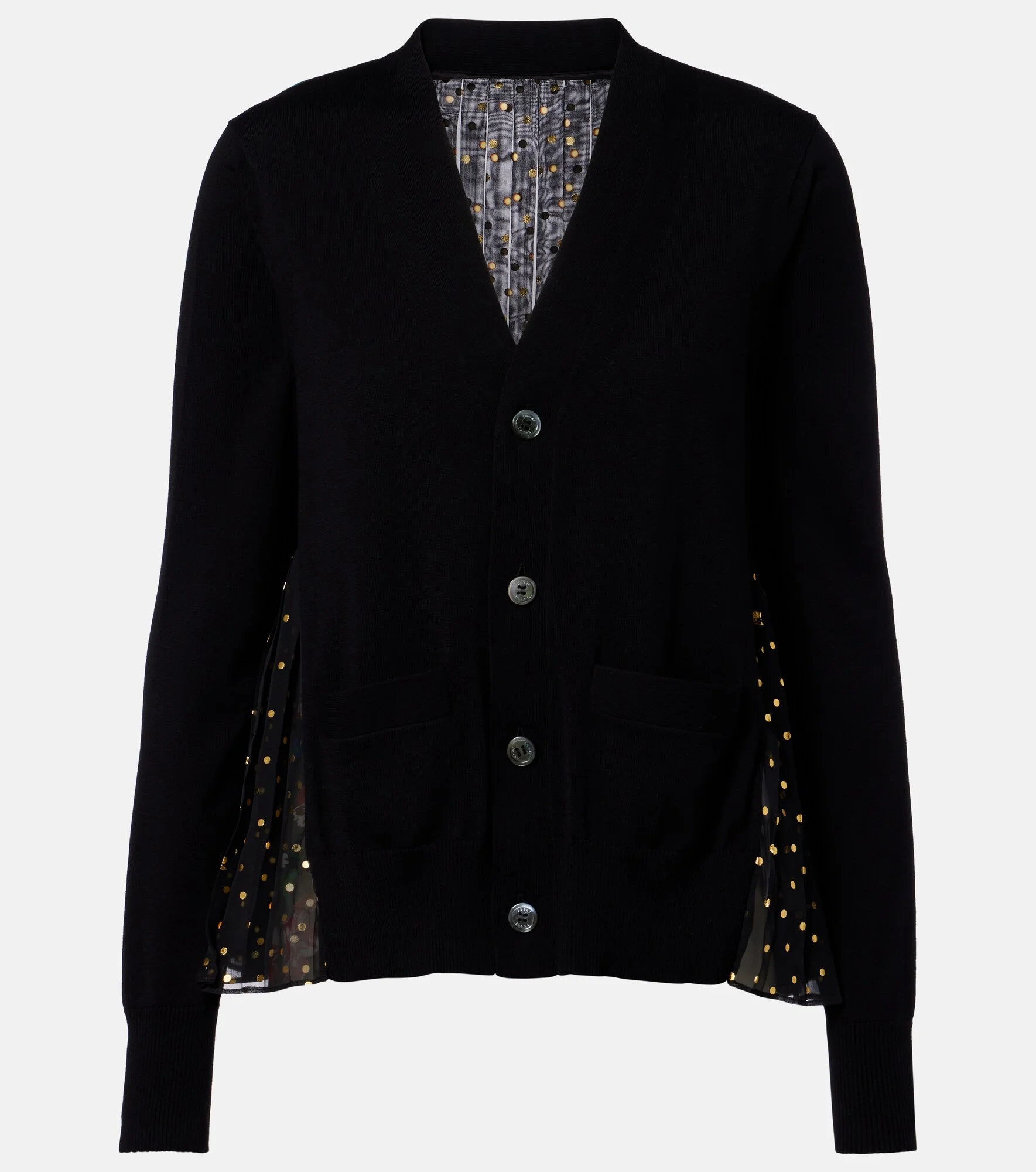 Sacai’s penchant for hybrid designs sees contrasting textures, fabrics, and techniques combined to create entirely unique and innovative styles. This cotton cardigan features knitted construction and vibrant prints all over. Product Details - Material: 100% cotton - Care instructions: dry clean - Made in China - Color: black - Designer color name: Ivory Glow - Material II: 100% polyester - Material III: 100% polyester - Closure: buttoned front - Cuff: ribbed - Pockets: welt pockets - Hem: ribbed - Item number: P01150941 Size & Fit - True to size - Designed for a loose fit - Partly stretchy fabric - Falls below the hip - The model seen in the picture is 178cm-5'10" and wearing a size 0